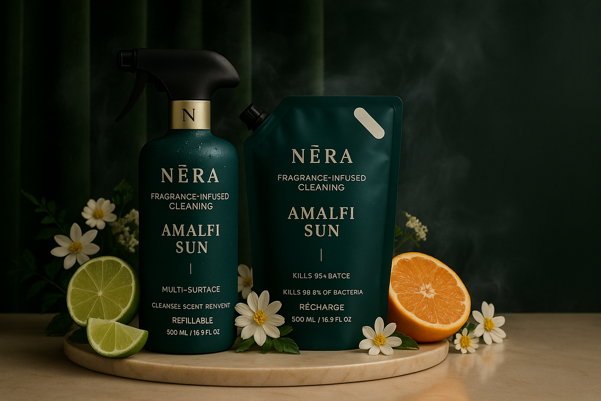 From your kitchen counters to your bathroom tiles, NĒRA simplifies and beautifies every touchpoint in your home. With three signature scents — Amalfi Sun, Oud Blanc, and Amber Rouge — carried across sprays, refills, cloths, and gloves, your space becomes a cohesive sensory sanctuary.